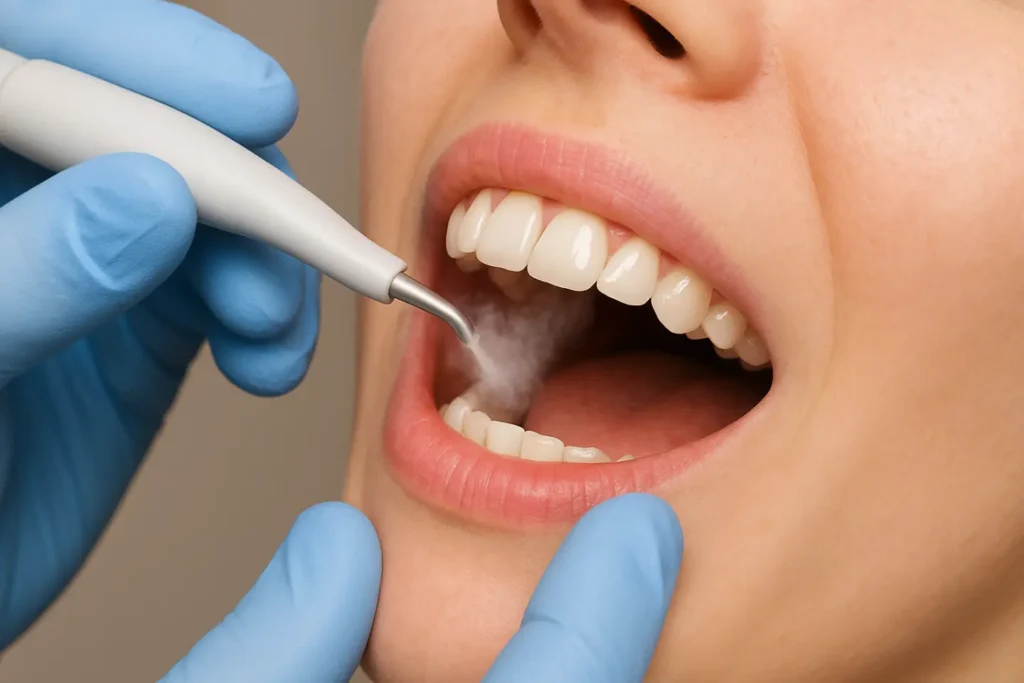 Zahnärzte nutzen spezielle Ozontherapiegeräte, die medizinisches Ozon erzeugen und gezielt über Sonden oder Applikatoren an die zu behandelnden Stellen bringen.